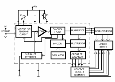 Conversia analog numerica este realizata cu circuitul integrat C520D. Acesta are iesiri multiplexate pe 3 digiti (-90.000.999). Este compatibil pin la pin cu circuitul integrat CA3162(E) si are urmatoarele caracteristici principale: