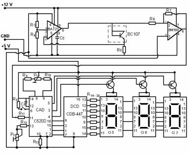Pentru calculul rezistentelor R14 R trebuie avut in vedere faptul ca C520D are iesirile mutiplexate, deci intr-o fractiune de secunda nu pot fi aprinsi toti cei trei digiti , ci numai cate unul ,prin rotatie. Datorita vitezei mari de multiplexare si inertiei ochiului omenesc , noi vom vedea toate cele trei cifre aprinse .Deci vom avea intr-un anumit interval de timp cel mult 7 LED-uri aprinse (7segmente). Considerand un curent de 40mA/segment, consumul maxim este de 280mA. In mod normal, curentul printr-un segment este de 10mA, dar s-a luat mai mare, tinand cont de faptul ca el nu mai este aprins tot timpul si si pentru a avea o luminozitate corespunzatoare. Nu trebuie depasit curentul maxim de varf repetitiv (60mA).