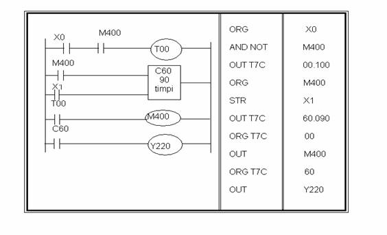 -Temporizari/numaratori - sistemul numerator este aditional.Numarul de puncte este de 96.Valoarea presata a temporizarii este de 0,01.9,99 sec.sau 0,1.99,9 sec.sau 1.999sec.temporizarile de la T0 la T9 sunt prestabilite pentru 0,1.99,9 sec.Valoarea presetata a numaratorului este de 1.999 timpi. Numaratorii de la C0 la C9 sunt presetabili pentru 1.9999 timpi.