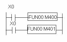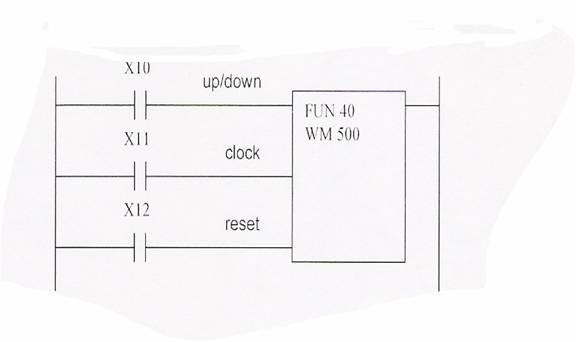 FUN40 este instructiunea de numarare crescatoare/descrescatoare.Acesta trebuie programata in combinatie cu o iesire interna (VM).Pentru inregistrare valorii curente a numaratorului crescator/descrescator sunt folositii 16 biti,de la numarul bobinei specificat de instructiune(M500...M515 in exemlul de mai sus).Valaorea curenta este specificata in 4 digiti BCD