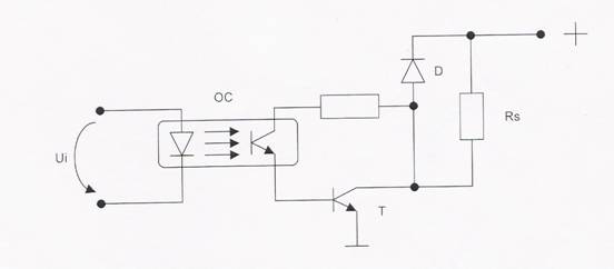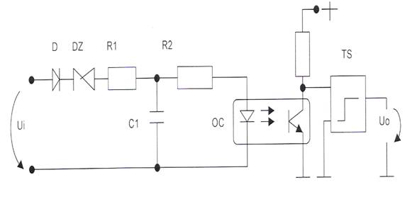 Circuitul din figura 2 din anexa contine un prim grup de elemente ce asigura detectia semnalelor pozitive cu o amplitudine sufficient de mare,diodele D si DZ si un circuit de intrare de tip trece-jos,R1,R2,C1.A doua parte a circuitului este obtinuta dintr-un formator cu prag de tip Schmith ce permite obtinerea caracteristicilor rectangulare si de nivel constant pentru semnalele prelucrate.Cele doua parti sunt cuplate printr-un element optocuplor OC ce asigura totodata separarea galvanica fata de sursa primara. Sistemula acesta asigura transferul marimilor de intrare pe magistrala de date a automatului.Daca prelucrarea logica a automatului este numai de tip secvential ,magistrala de date cuprinde numai o singura linie pe care vehiculeaza informatia respective.In cazul in care procesul automatului este de tip numeric atunci magistrala cuprinde in mod curent 8