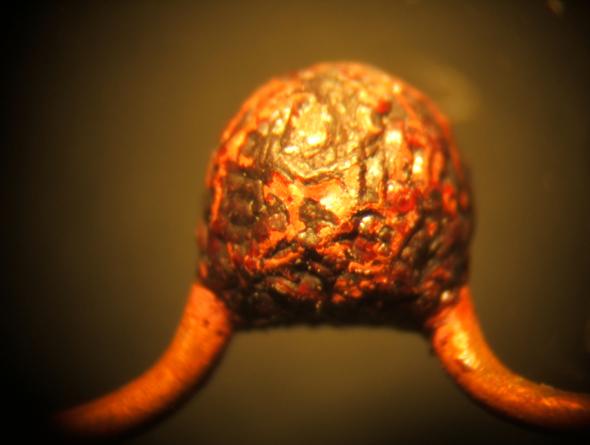 Experimentarile derulate in vederea controlarii momentului si a locului de formare a descarcarilor plasmagene au evidentiat faptul ca incepand de la aproximativ 100 W putere emisa de magnetron se pot initia descarcari capabile sa incalzeasca local metalul. Marind puterea pana in jurul valorii de 300 W a fost posibila topirea locala a aliajului de cupru utilizat in experimentari, ajungand astfel la sudarea cap la cap a doua sarme (figura 3).