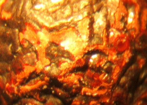 Analizand suprafata metalului topit se observa faptul ca datorita descarcarii plasmagene metalul a atins local o temperatura apropiata de temperatura de fierbere, iar viteza de racire a fost atat de mare incat metalul s-a solidificat instantaneu si elementele chimice din compozitia aliajului au ramas partial neprinse in aliaj si libere fiind au fost oxidate in timpul descarcarii (figura 6).
