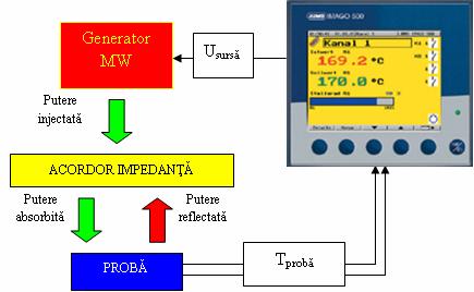 Deoarece materialele termoplastice nu sunt bune absorbante de microunde, ele nu se incalzesc daca sunt introduse intr-un camp de microunde. Din acest motiv se propune utilizarea unui susceptor ce contine particule polare, prezenta acestuia in contact cu polimerul fiind absolut necesara, dat fiind faptul ca ceramica este un foarte bun absorbant de microunde. Gradul de absortie al microundelor si transformarea acestora din energie electromagnetica in energie termica este dat de un indicator al nivelului defectelor de material, indicator care poarta numele de tangenta a unghiului de pierderi. Pentru controlul procesului se utilizeaza un regulator care inregistreaza temperatura dupa un gradient impus. In figura 7 este prezentat regulatorul de proces si principiul de realizare a buclei de reglare care comanda cuptorul cu microunde.