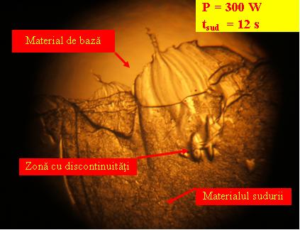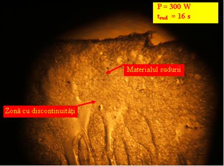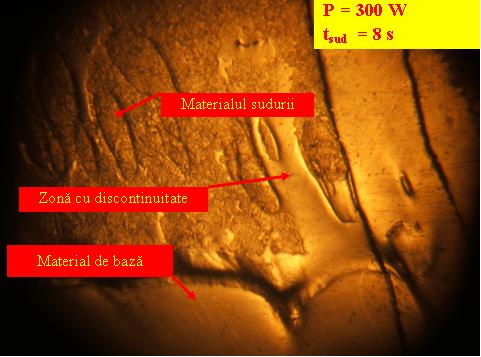 Puterea fasciculului de microunde a fost crescuta treptat de la 0 W la 300 W urmarindu-se evolutia temperaturii foliei din material termoplastic. Imbinarile (fig. 11) s-au realizat in intervalul de temperaturi de 180210 oC. Analizand imbinarile sudate s-a putut observa ca sudurile sunt partial continue, discontinuitatile locale datorandu-se contactului imperfect dintre cele doua materiale de baza.