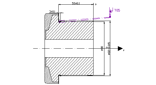 N280 G36 XZ N290 G00 G27 G96 X0 Z2 S1225 F0.411 M08 N80 G01 X55 N90 Z81.2 N100 Z-81 N110 M09 |