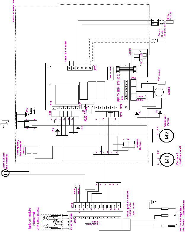 Un termostat de camera este conectat printr-un cablu de forta la XT5 de pe panoul terminal - sectiunea recomandata pentru firele electrice este īntre 0,5 si 1,5 mm² conditia neaducerii unei tensiuni straine pe termostatul de camera trebuie respectata.