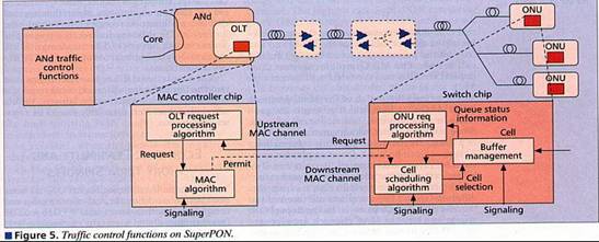 Sistemul APON poate fi considerat ca un multiplexor distribuit care multiplexeaza fluxurile ONU in OLT si respectiv fluxurile VP/PC (bazate pe ATM) in ONU. Pentru a asigura o eficienta mai buna si pentru a preveni coliziunile, multiplexarea per ONU cere controlul general al OLT. Controlul sistemului se numeste protocolul MAC. Datorita numarului mare de utilizatori in sistemul SuperPON este foarte important sa se poata valorifica avantajul multiplexarii de surse cu debitul variabil.Aceasta e de folos mai ales in cazul traficului in rafala ca TCP/IP. Largimea de banda trebuie sa fie alocata ONU-urilor intr-un mod dinamic. Asadar alocarea largimii de banda depinde de informatia in timp real referitoare la starea curenta a cozilor formate la ONU si nu numai de parametrii transferati in timpul initializarii. Implementarea MAC va afecta ONU si OLT ca in figura 5[7].