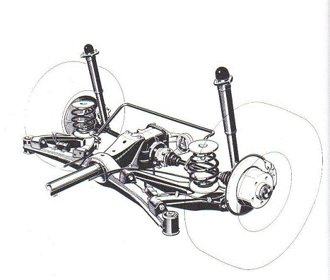 In figura 2.9 se prezinta sistemul de montare si de ghidare cu semilamela parabolica de sustinere si lamela elastica parabolica folosit de RENAULT. Suspensia puntii are doua amortizoare montate in fata puntii si inclinate spre fata precum si bara stabilizatoare.