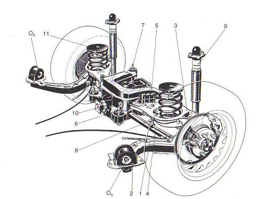 Fig.3.9.PMS fractionata cu brate multiple (BMW): 1-brat longitudinal inferior; 2-articulatia cilindrica elastica a bratului longitudinal cu caroseria;3-brat transversal superior; 4-brat transversal inferior; 5-supor 525c27f t central; 6,7-reazemele elastice ale suportului central pe caroserie; 8-bieleta barei stabilizatoare; 9-amortizor; 10-carter central; 11-arc elicoidal; Oh -Centrul articulatiei bratului longitudinal cu caroseria.