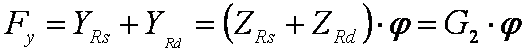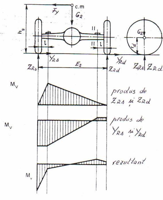 In regimul deraparii (regimul deplasarii cu reactiuni laterale maxime) asupra puntii actioneaza fortele: din partea sasiului sau a caroseriei componenta statica ce revine puntii din spate G2 si componenta fortei laterale Fy, iar din partea caii reactiunile normale ZRs si ZRd si si reactiunile laterale YRs si YRd. Acestea se determina cu relatiile: