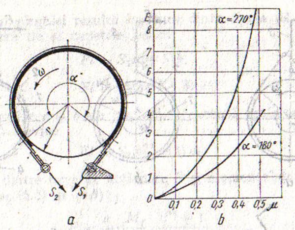 Frana cu banda exterioara se foloseste ca frana de serviciu la unele tractoare, ca frana de stationare si de siguranta la unele autocamioane si ca frana de blocare pentru schimbarea treptelor de viteza la unele transmisii automate. Aceasta frana se utilizeaza mult in mecanismele de directie ale tractoarelor pe senile. In figura 2.22.a se prezinta schema de principiu a franei cu banda. Ea se compune dintr-o banda elastica din otel, prevazuta pe partea interioara cu o garnitura de frictiune, care se poate strange datorita unui sistem mecanic pe suprafata exterioara a unui tambur, rezultand un moment de franare.