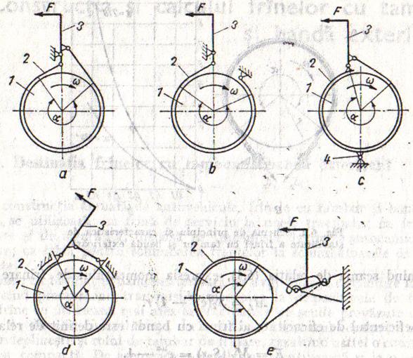Eficacitatea franelor cu tambur si banda exterioara este dependenta de modul de fixare al capetelor benzii. Scheme constructive de astfel de frane sunt prezentate in figura 2.23.