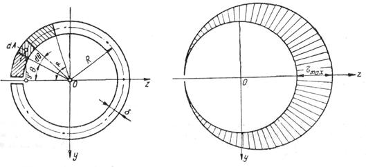 6. Sa se construiasca diagrama suprafetelor-sector la profilul subtire în forma de inel, taiat ca în figura 7. Centrul de încovoiere se afla în sens opus taieturii, la distanta 2R de centrul inelului. Pentru calculul suprafetelor-sector se foloseste relatia de definitie: