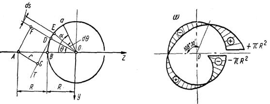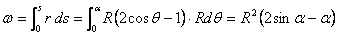 unde originea arcelor este în punctul B. pentru a calcula suprafata-sector într-un punct curent a, definit de unghiul , se ia o variabila intermediara , care defineste un punct D, precum si un unghi d , care defineste punctul infinit vecin E. Ducând tangenta la linia mediana (cerc) în punctul D si normala pe ea din centrul de încovoiere se afla raza r = AC = FD. Conform desenului:
