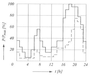 În figura 1 se prezinta curba de sarcina zilnica pentru un consumator casnic. Se constata prezenta a doua vârfuri de sarcina, unul de dimineata si altul ceva mai mare de seara, vârfuri datorate în special consumului pentru iluminatul electric si a doua goluri de sarcina unul de noapte si altul de zi. Se mai constata ca vârfurile de sarcina pentru o zi de iarna sunt mai mari si au o durata mai mare decât pentru o zi de vara, din cauza perioadei mai lungi a întunericului.