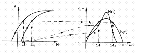 evidentiaza faptul ca variatia īn timp a curentului de mers īn gol, i10(t), reproduce la alta scara dependenta HFe (t). Curba H(t) , respectiv variatia īn timp a curentului de mers īn gol i10(t), se construieste pe baza ciclului dinamic de magnetizare B(H), fig.3.24, si a dependentei sinusoidale B(t) a inductiei īn miez. Se observa pe de o parte ca curba curentului de mers īn gol este nesinusoidala si pe de alta parte ca fundamentala curentului este defazata īnaintea fluxului magnetic īn miez, ambele rezultate fiind datorate fenomenului de histerezis magnetic. Curentul de mers īn gol este defazat īn raport cu tensiunea de alimentare cu mai putin de 90 ; acest defazaj va fi si mai redus īn conditiile luarii īn considerare si a celei de-a doua componente a pierderilor īn miez, cele prin curenti turbionari.