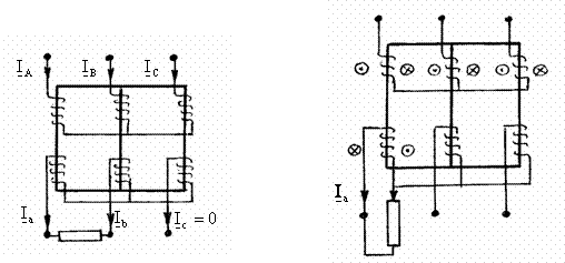 Sarcina monofazata din secundar se reflecta īn primar ca o sarcina conectata īntre doua faze, iar solenatiile rezultante pe cele trei coloane sunt nule.