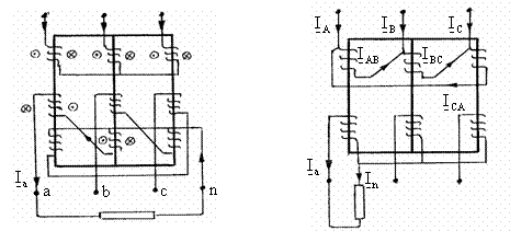 b3) Īn cazul unui transformator cu conexiunea Yz, stea īn primar si zigzag īn secundar, fig. 3.41, avānd o sarcina monofazata conectata īntre faza a si nul, aplicarea legii circuitului magnetic conduce la relatiile: