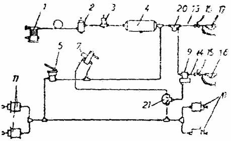 In figura 5. este reprezentata schema actionarii pneumatice cu o conducta. Compresorul 1, actionat de motorul automobilului, comprima aerul admosferic trecându-l prin filtrul 2 si regulatorul 3 , în rezervorul 4. Când presiunea aerului în rezervoare a atins valoarea prescrisa, regulatorul 3 întrerupe debitarea cu aer de la compressor. In unele cazuri, pe rezervor se monteaza o supapa de siguranta reglata pentru o presiune de (0,7.0,8)MPa. La scaderea presiunii din rezerevor sub o anumita limita, regulatorul uneste din nou compresorul cu rezervoarele.