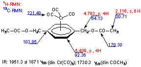 1.1. Sinteza complexului de diacetat de 1,4-dimetilolbenzen-tricarbonil.crom a fost efectuata pornind de la 1,4-dimetilolbenzen care a fost acetilat cu un exces de anhidrida acetica în piridina pentru a obtine diacetalul corespunzator si apoi complexat prin reactie directa cu cromhexacarbonil prin încalzire la reflux într-un amestec de solventi diglim-heptan 10:1, sub inert4. Dupa efectuarea reactiei de complexare produsul a fost separat prin evaporarea solventului, cromatografie (alumina, eluent eter de petrol-dietileter) si recristalizere din n-heptan.