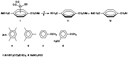 (b) Au fost efectuate si încercari de condensare între complexul 1 si un amestec continând duren (a), mesitilen (b), anisol (c) si 1,3-dimetoxibenzen (d) la un raport molar de 1:2:2:2:2 (1:a:b:c:d). Dupa efectuarea reactiei amestecul de produsi a fost decomplexat prin oxidare blânda (NaNO2/HCl) si analizat gaz-cromatografic cu detectie prin spectrometrie de masa (GC-MS). Cromatogramele au pus în evidenta existenta, alaturi de arenele nereactionate, a unor produsi de condensare dar si de diacetilare, 11. Principalul produs de condensare identificateste cel cu structura 12d (Schema 3) indicând faptul ca m-metadimetoxibenzenul este arena cea mai reactiva.