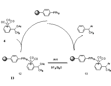 Fixarea pe suport solid a complexului pentru efectuarea unei reactii de condensare enantioselectiva cu arene reactive poate fi realizata prin modalitatea predata în Schema 6 folosind drept linker un derivat de trifenilfosfina ancorat pe polimer. Astfel de materiale sunt disponibile comercial dar costul lor este foarte ridicat. În acest fel a aparut interesant sa se studieze reactia, mult mai ieftina, între complex si trifenilfosfina ca model pentru fixarea pe suport.
