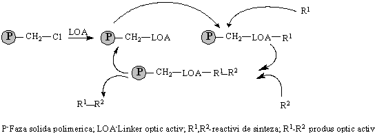 Pentru etapa pe anul 2003 a proiectului nostru a fost prevazuta sarcina de a realiza sinteze prin reactia de reducere enantioselectiva pe o faza solida cu linker optic activ. In acest scop, principiul de lucru adoptat este prezentat in Schema 1.