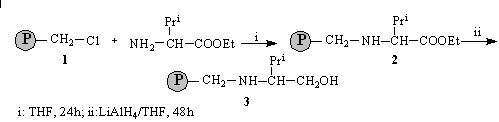 1.3 Condensarea L (+)-valinei cu faza solida a fost realizata pornind de la 2g rasina clorometilata 1 (cu un continut de 4,42 mmol Cl (g)) care a fost tratata cu un exces de L-(+)-valina (3 mmoli) în prezenta de bicarbonat de sodiu anhidru (6 mmoli) în THF (30ml). Reactia a fost efectuata la 65oC timp de 24 ore, cu agitare, produsul final fiind spalat succesiv cu THF, CH3OH si CH2Cl2 si uscat în vacuum.