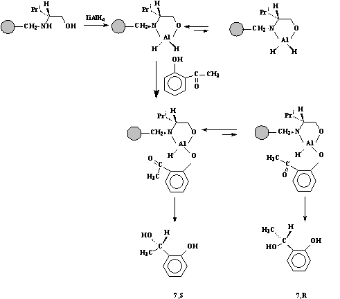 Schema cuprinde obtinerea fazei solide pentru reactia enantioselectiva prin atasarea la structura de polimer clorometilat a unui linker optic activ.Acesta este in cazul nostru un rest de L-valinol, optic activ rezultat prin cuplarea cu esterul L-valinei urmata de reducerea la L-valinol, cu LiAlH4. Pe faza solida astfel obtinuta se fixeaza apoi reactivul R1 care, in cazul de fata este hidroaluminatul de litiu. Pe noua faza solida astfel preparata se fixeaza al doilea reactiv, R2 constituit dintr-un compus carbonilic prochiral (cetona nesimetrica). In complexul rezultat are loc reactia de reducere a gruparii carbonil prin donorul de hidrura (Al-H). Datorita ambiantei chirotrope creata de atomul de carbon asimetric din L-valinol, este de asteptat ca reducerea sa fie enantioselectiva. Dupa ce reactia de reducere a avut loc se realizeaza detasarea de pe faza solida a produsului de reducere R1-R2 (in acest caz alcoolul secundar chiral corespunzator cetonei) printr-o simpla hidroliza care regenereaza totodata faza solida optic activa apta pentru un nou ciclu de reactii.