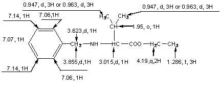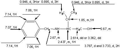 1.3. Reducerea compusului 1.1 cu LiAlH4 a fost realizata conform Schemei 5 utilizând 1.06 g (3,12mmoli) compus 1.1 si 0,5g (13.1 mmoli) LiAlH4în 20mL eter anhidru si 20mL THF. Dupa un timp de reactie de 4 ore prelucrarea standard (descompunere cu solutie 15% NaOH) extractie solidului cu THF-Et2O, spalare, uscare si evaporarea solventului a condus la N-benzil valinol cu un randament de 55%.