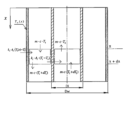 O a doua ipoteza simplificatoare este aceea ca între teava exterioara si scoarta terestra nu exista nici o rezistenta termica, deci s-a presupus ca în punctul de contact temperatura pamântului la o anumita adâncime este si temperatura pe fata exterioara a tevii exterioare la aceeasi adâncime.