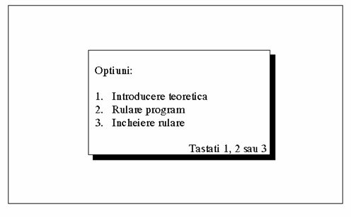 Executia programului se încheie si se revine la ecranul care afiseaza optiunile de rulare efectiva, de parcurgere a introducerii teoretice sau de parasire a programului.