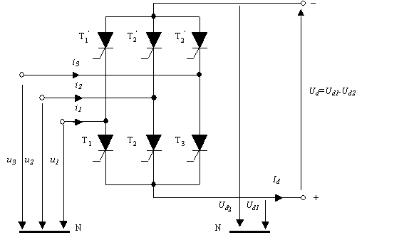 In figura 1 este reprezentat circuitul de forta al redresorului trifazat cu punct median,