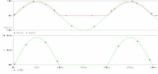 ANALIZA PSPICE Redresor monofazat monoalternanta necomandat cu sarcina rezistiva R VS 1 0 SIN(0V 10 V 50 Hz) D 1 2 DINT R 2 0 1k .MODEL DINT D ; dioda modelata DINT se gaseste ub biblioteca PSpice .TRAN 0.1ms 40ms 0ms ;analiza in timp in regim tranzitoriu .FOUR 50Hz V(2) V(1) .PROBE .END |