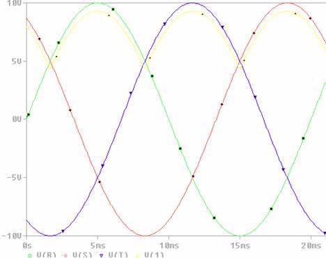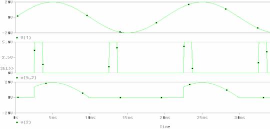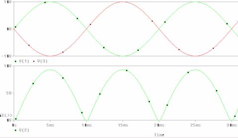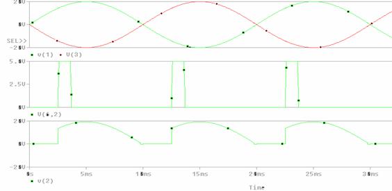 ANALIZA PSPICE Redresor bifazat bialternanta cu sarcina R si filtru C V1 1 0 SIN(0V 10V 50Hz) V2 0 3 SIN(0V 10V 50Hz) D1 1 2 DINT D2 3 2 DINT R 2 0 1K C 2 0 25uF .MODEL DINT D .FOUR 50Hz V(2) I(R) .TRAN 0.1ms 40ms 0ms 0.05ms .PROBE .END |