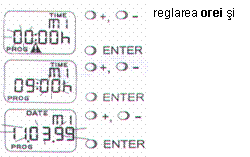 C1: Reglarea orei exacte si a datei m MODE afisarea orei m ENTER reglarea orei m m - modificarea valorii care lumineaza intermitent si m ENTER confirmare si trecere la urmatoarea valoare C2:Modificarea temporara a temperaturii