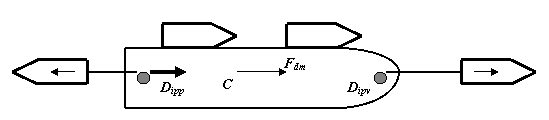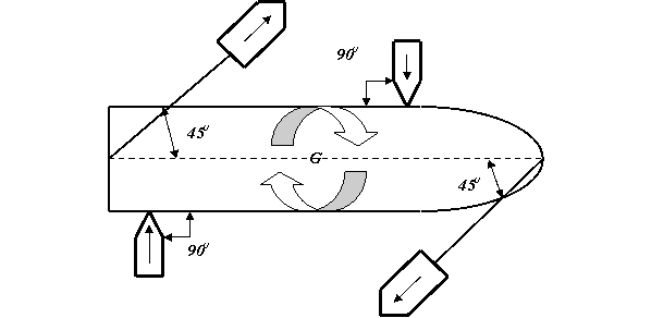 pentru deplasare înainte si paralel cu planul diametral al navei remorcate, în centrele initiale de deriva (prova, pupa).
