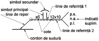 Indicatiile suplimentare se inscriu la capatul liniei de referinta, intre ramurile unei bifurcatii, in urmatoarea ordine: procedeul de sudare (printr-un numar ce codifica procedeul de sudare), nivelul de acceptare, pozitia de lucru, materialul de adaos etc.