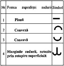 Simbolurile secundare indica forma suprafetei exterioare a sudurii. Acestea se inscriu doar daca se impun conditii privind forma exterioara a sudurii (tabelul 3).