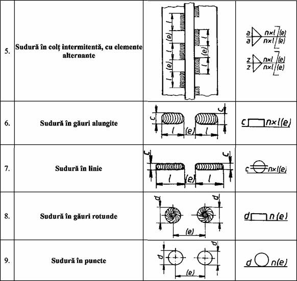 e - distanta intre doua elemente de sudura vecine (pentru pozitiile 4, 5, 6 si 7 din tabel) sau distanta dintre axe (pentru pozitiile 8 si 9 din tabel);