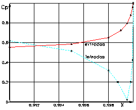 Fig.4.16 Cāmpul coeficientului de presiune, pe frontiera profilului reversibil īn S - zona bordului de fuga, curgerea directa - sectiunea 0 |