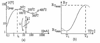 se obtin expresiile tensiunii si curentului prin termistor in functie de temperatura:
