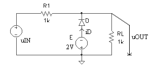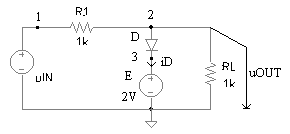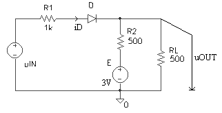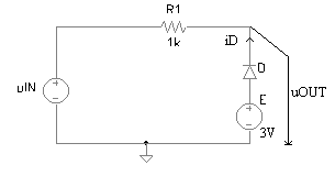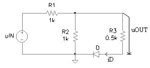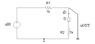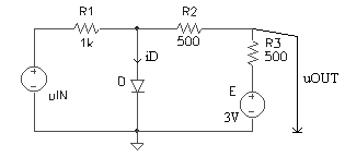 Pentru circuitul din figura 3.2a, stiind ca tensiunea de intrare uIN -10V, 10V , sa se deduca expresia tensiunii uOUT si sa se reprezinte grafic. Care este valoare maxima a curentului prin dioda D? Parametrii ce caracterizeaza dioda sunt: uD0 = 0,6V, rD = 10W si IS = 0A.