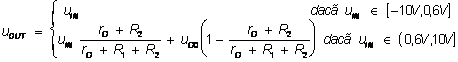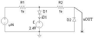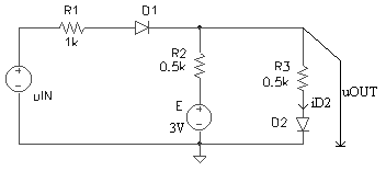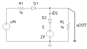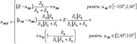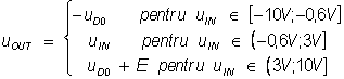 Pentru circuitul din figura 3.10a, stiind ca tensiunea de intrare uIN -10V, 10V , sa se deduca expresia tensiunii uOUT si sa se reprezinte grafic. Care este valoare maxima a curentului prin dioda D2? Parametrii ce caracterizeaza dioda sunt: uD01,2 = 0,6V, rD1,2 = 0W si IS1,2 = 0A.