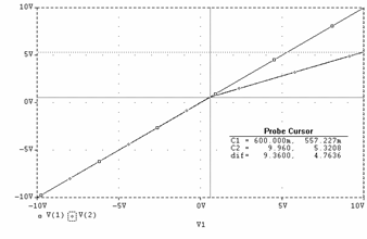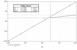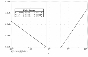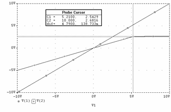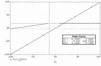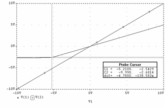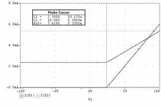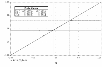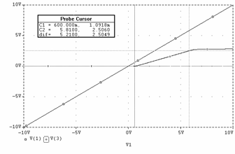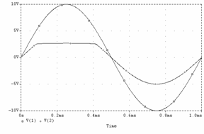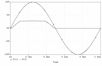 Daca la intrare se aplica un sinus cu frecventa de 1KHz si amplitudine de 10V se obtine la iesire o forma sinusoidala atenuata la jumatate (pe portiunea în care dioda este blocata, conform cu relatia ce descrie uOUT2) si un palier de tensiune cvasi orizontal atunci când dioda conduce. Figura 3.3f reda grafic (curba V(2)) aceasta forma.