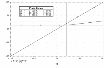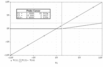 Pe figurile ce vor prezenta în continuare grafic rezultatele, primul cursorul (C1) este reprezentat cu o linie punctata deasa, iar cursorul al doilea (C2) cu o linie punctata mai rara. În acelasi timp v(1) este aliasul pentru uIN , iar v(2) pentru uOUT.
