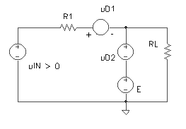 Se stabilesc starile posibile ale diodelor din circuit. (Teoretic acestea pot fi patru.) Se pleaca de la presupunerea ca uIN = 0 pentru care ambele diode sunt blocate. Daca uIN devine mai mica ca 0, starea de blocare (a abelor diode) se mentine. Daca uIN devine pozitiva se va deschide întâi dioda D1 si apoi D2. Vom avea deci urmatoarele stari: