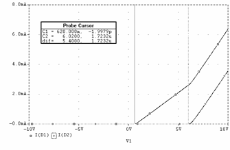 Pentru determinarea valorii maxime a curentului iD2 se poate scrie Kirchhoff 1 în nodul adiacent ambelor diode: