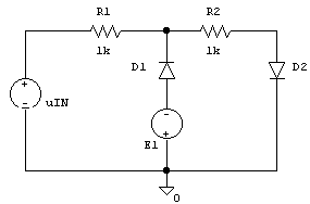 Pentru circuitul din figura 4.2a, stiind ca tensiunea de intrare uIN -10V, 10V si tensiunea E1=3V, sa se deduca expresia tensiunii uOUT si sa se reprezinte grafic. Care este valoare maxima a curentului prin dioda D2? Sa se reprezinte pe acelasi grafic uIN si uOUT daca uIN este un semnal sinusoidal cu amp 141x2315b litudinea de 10V si frecventa de 1kHz.Parametrii ce caracterizeaza diodele sunt: uD0 = 0,6V, rD = 10W si IS = 0A.